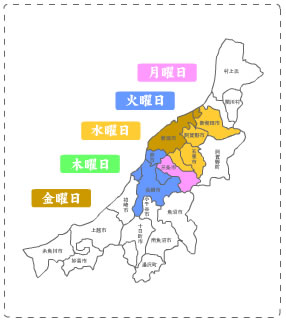 月曜日: 新発田市・聖籠町・阿賀野市・五泉市・新潟市北区・秋葉区 火曜日: 新潟市中央区・西区・東区・江南区 水曜日: 新潟市南区・西蒲区・三条市・燕市・弥彦村・田上町 木曜日: 新発田市・聖籠町・阿賀野市・五泉市・新潟市北区・秋葉区 金曜日: 新潟市中央区・西区・東区・江南区 土曜日: